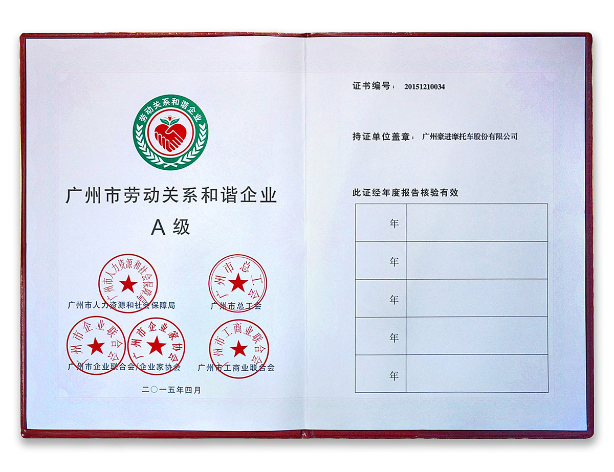 广州市劳动关系和谐企业A级证书