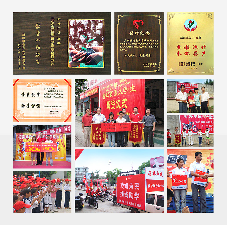 公司快速、稳健发展的同时,以高度的责任感认真履行社会责任、热心公益事业。近年来,分别为增城市教育系统捐赠助学基金500多万元;为暨南大学扶贫扶优奖学金捐赠100万元;为增城市扶贫济困慈善捐赠500万元;为增城市多个公安、治安部门捐赠警用汽车20多台、警用摩托车500多台,价值近500万元;为广州市见义勇为基金会捐赠200万元;并多次以各种方式向社会各界捐款、捐物等;累计慈善捐赠超过伍仟万元人民币。
