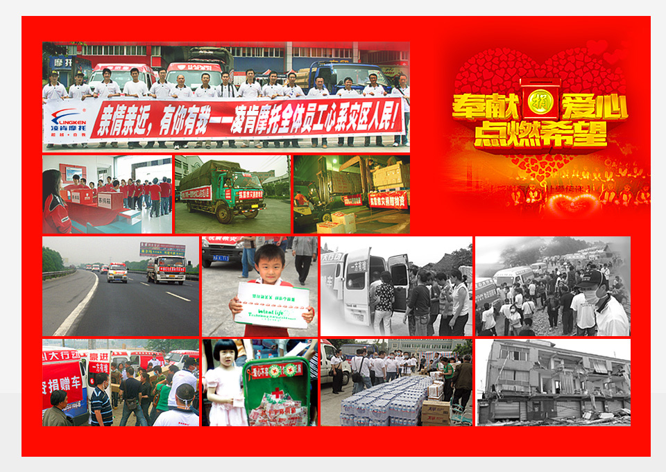 2008年5月12日,四川省汶川县发生8.0级特大地震,数百万同胞流离失所,举国关注。凌肯公司心系灾区人民,公司领导于13日赶赴成都与四川商家联合组成“凌肯摩托抗震救灾指挥小组”,当天组织起一支30名工作人员、9台服务车的前线救援队,就地采购物资,直接开赴灾区发放救援物资给灾区同胞,第一时间以最快的相应速度援助灾区人民。